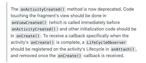 2020년 3월 18일 Android 업데이트 이후 Fragment의 onActivityCreated()가 deprecated 됐다. 그로인해 Activity의 생명주기와 Fragment의 생명주기가 서로 영향을 덜 주는 방향으로 개편되었다. 원래 onActivityCreated()의 존재 이유 자체가 Activity의 생성이 끝나야만 처리되어야 하는 로직이 Fragment에 있을 때 위한 것이다. 기존에는 onActivityCreated()에서 Fragment 관련 초기화 루틴을 거의 수행했었는데 onActivityCreated()가 사라지면서 공식문서에서는 View 관련 초기화는 onViewCreated(), 나머지 초기화 후은 onCreate()에서 수행하라고 나와있다.